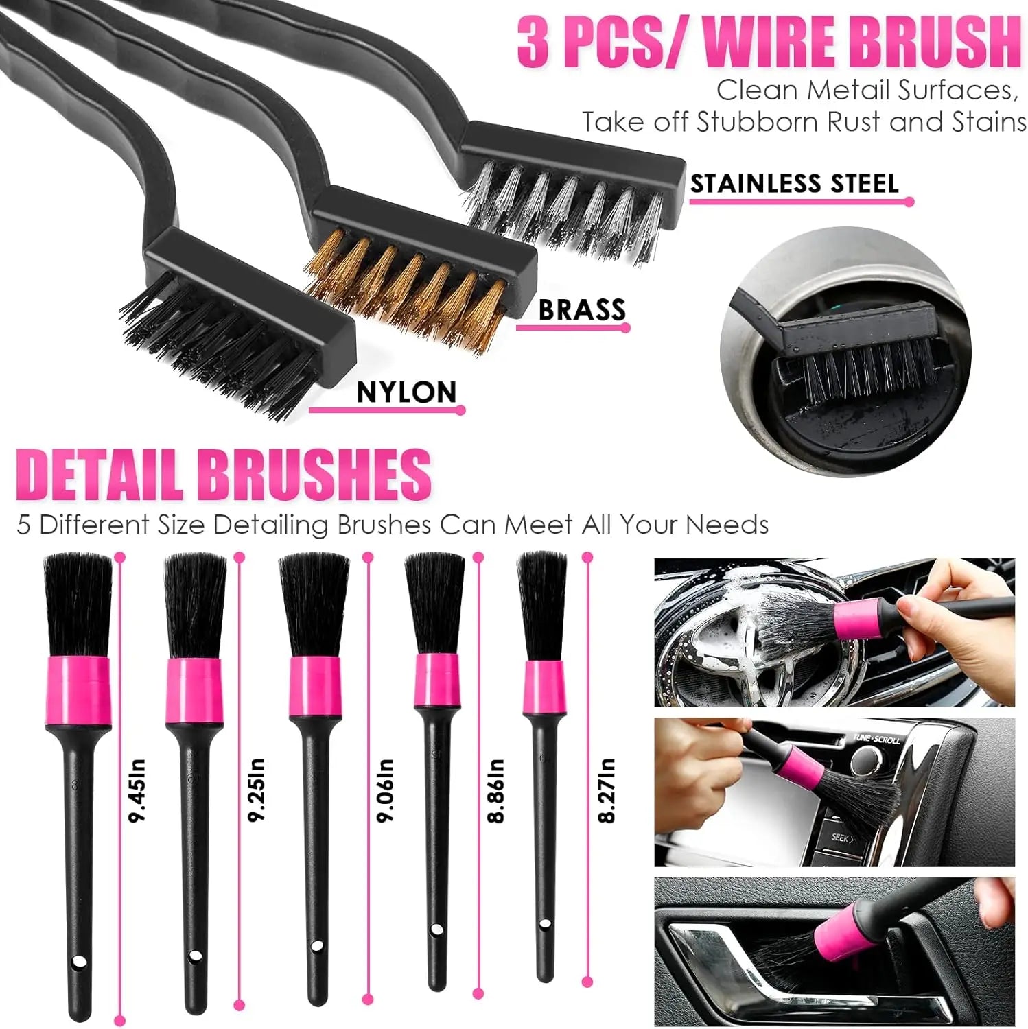 Exterior Cleaning: Car windshield cleaning designed with 180° swiveled triangular head to make a complete contact to the glass, which is easy to clean the bottom of car windows or some hard to reach areas. 3 different styles of wire brush kit can help you clean hard moved rust and detains, but care for not hurting your car