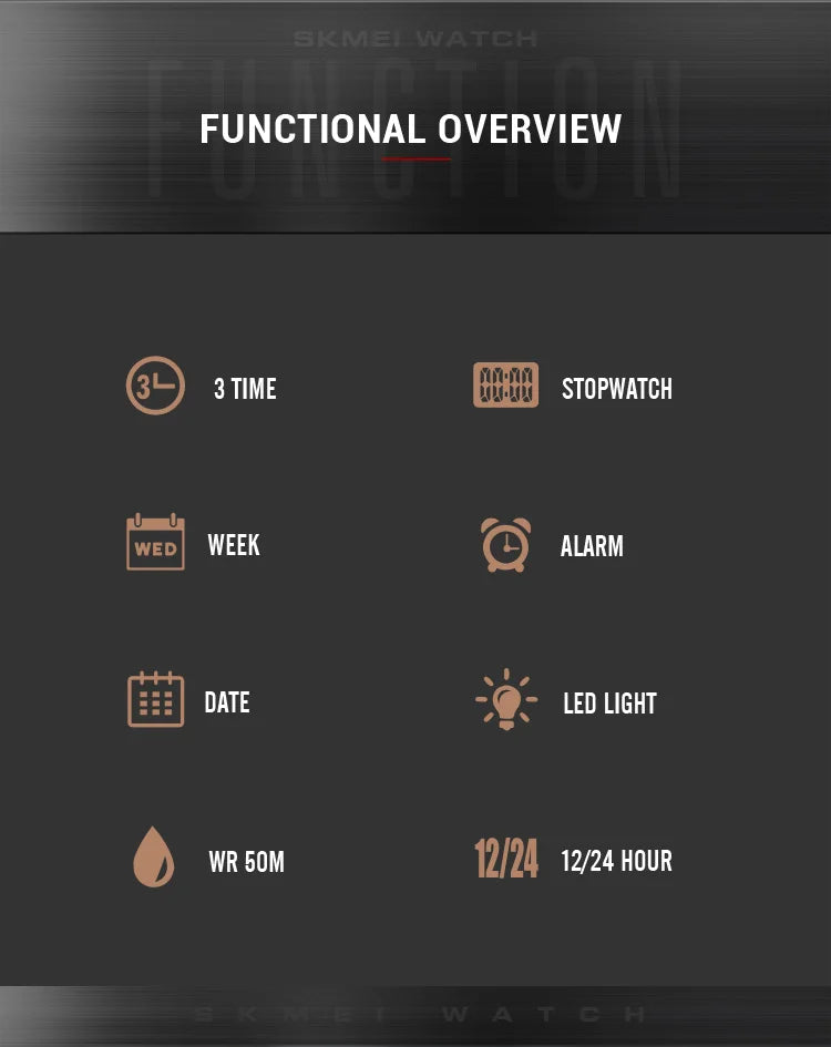 8.Function:3Time, Chrono, Alarm,Date, Week, LED Light,12/24 hour clock.
