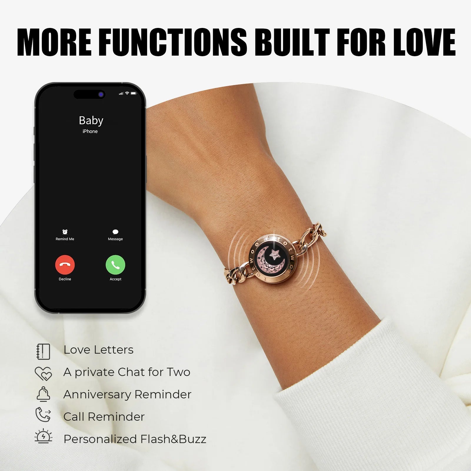 Adjustable light color and vibration intensity allow the bracelet to flash and buzz on your preference. Feel your partner’s love and touch on your wrist, always at the ready.